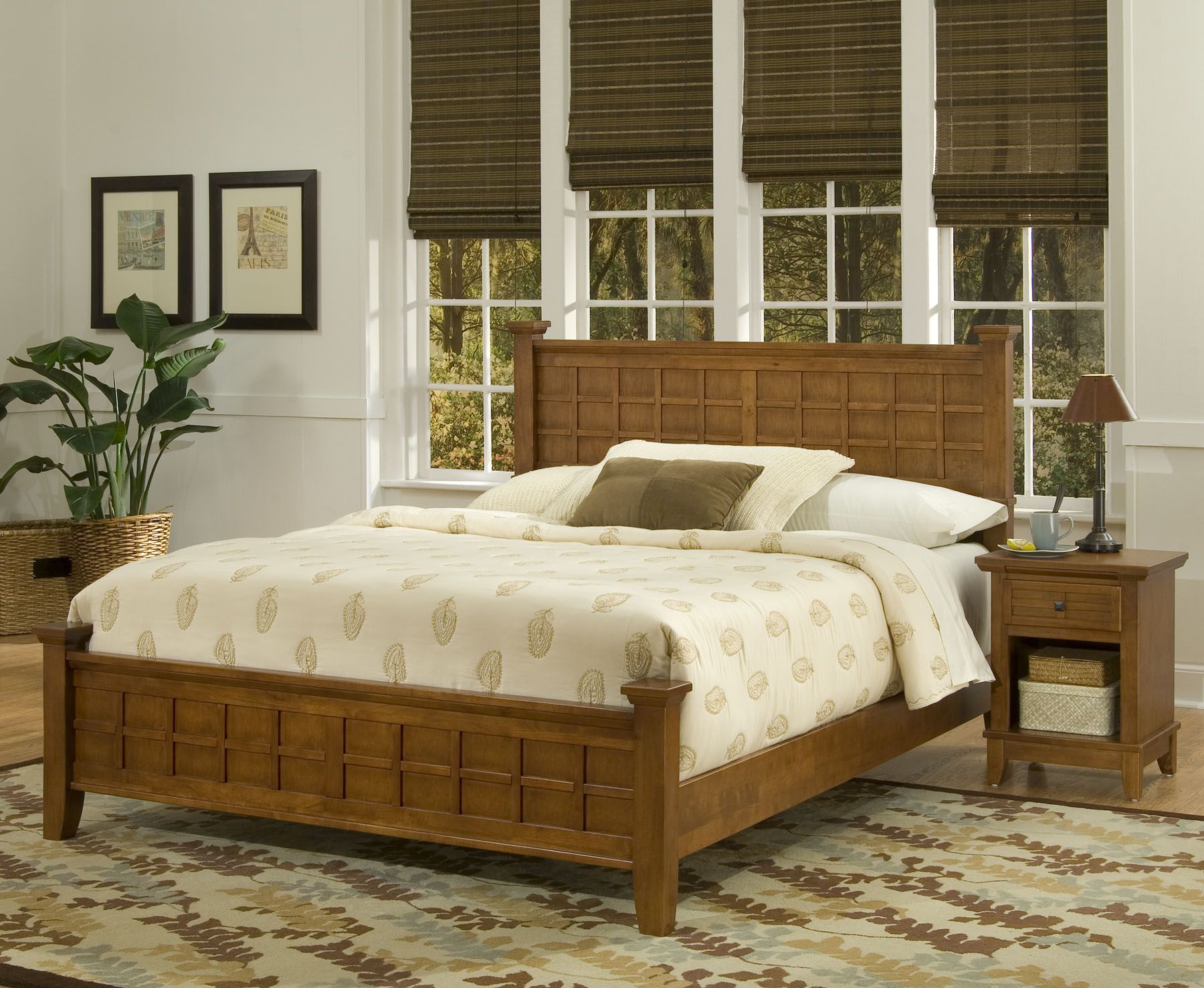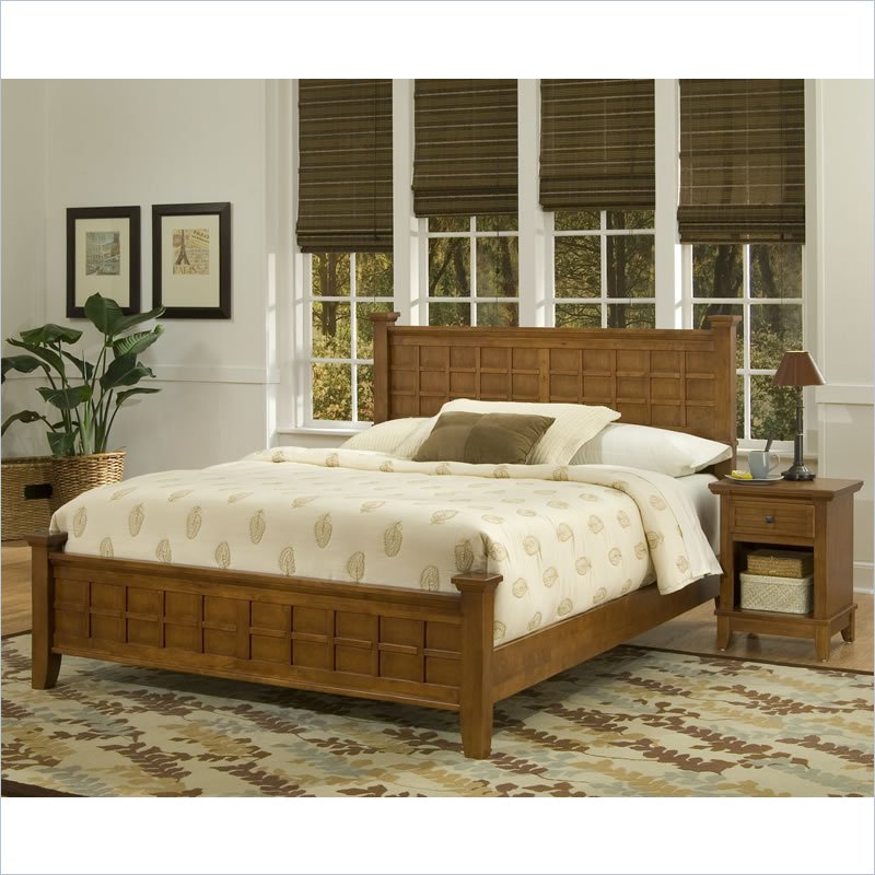 Arts amp; Crafts Queen Bed amp; Night Stand are Mission Styling at its best The Arts amp; Crafts Queen Poster Bed embellishes typical mission styling with raised wood lattice moldings and slightly flared legs. Finished in a warm Cottage Oak finish over hardwood solids and hardwood veneers this bed s simplistic yet detailed design makes it an ideal piece for any bedroom setting. Overall size with a standard queen mattress: 64.25w 89d 48.5h Headboard size: 64.25w 4d 48.5h Footboard size: 64.25w 4d 21h Rail size: 82w 2d 6h The Arts amp; Crafts Night Stand embellishes typical mission styling with a framed drawer showcasing raised wood lattice moldings and slightly flared legs. Finished in a Cottage Oak finish over hardwood solids and engineered woods with square brushed nickel hardware this night stand s simplistic yet detailed design makes it an ideal piece for any bedroom setting. The top of the hidden pullout tray features a scratch and stain resistant finish. Size: 18w 16d 24h.